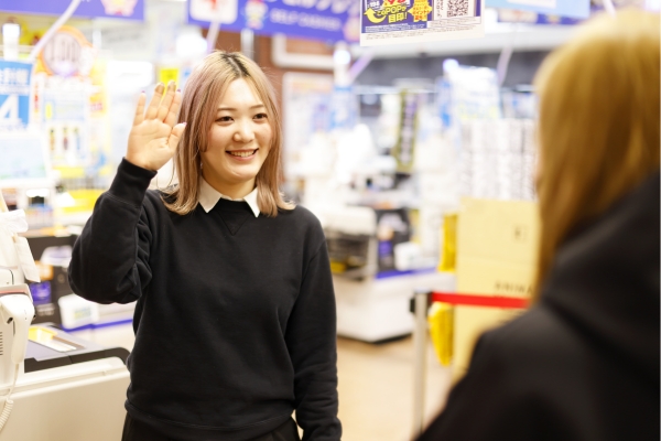 専門学校の学生の時に3年間、ドン・キホーテ町屋店でアルバイトをしていました。卒業後は保育園に勤務。保育士の仕事はやりがいがあったのですが、アルバイトをしていたドン・キホーテの方が福利厚生も残業管理もずっとしっかりしていて、安心して働けたということに気づいてから、改めてドン・キホーテで働く魅力を思い返すようになってきました。そこで保育園を退職し、MEGAドン・キホーテ春日部店にアルバイトとして再入社。次の仕事が見つかるまでのつなぎのつもりだったのですが、そのまま選任社員としてフルタイムで働くようになりました。やがて困っている店舗を助けるエリアレジ管理者の仕事がしたいと思うようになり、上長に相談したところ、まずはレジリーダーを経験するとよいと助言をいただきました。そこで境大橋店でレジリーダーを2年間勤め、正社員になりました。現在は17店舗を担当するエリアレジ管理者です。通勤に便利な場所にある社宅も借りられましたし、残業も少なく公休もしっかり取れる環境で、プライベートも充実しています。
