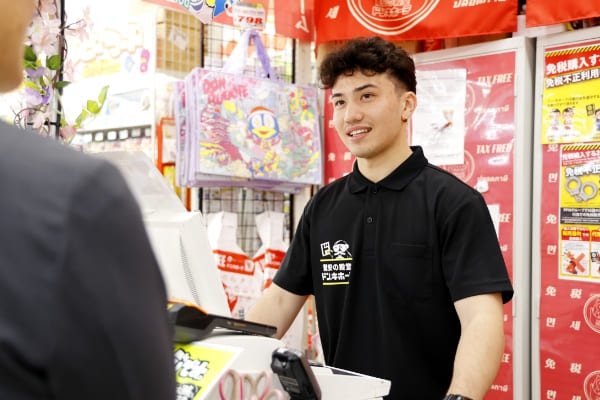母が日本人で父はアメリカ人。ロサンゼルスで生まれ育ちました。日本にいる祖母と一緒に暮らしたい、そして自分のルーツである日本の文化や言葉をもっと学びたいと思い、ハイスクール卒業を機に来日しました。語学の勉強のために、日本語を話す機会があり、同時に、英語も生かせる仕事に就きたいと思い、見つけたのが免税品コーナーのあるドン・キホーテです。ドン・キホーテのお店は旅行で日本に来た時に何度も訪れたことがあるし、アメリカにもドン・キホーテの系列会社があって親しみを持っていたことも、アルバイトとして選んだ理由の一つです。面接してくれたフロア責任者も外国籍の方で、英語と日本語が混ざり合った面接でした。海外から来た者同士ということで私の気持ちもよく分かってくれて、リラックスした雰囲気に安心感が持てたので、入社を決めました。ドン・キホーテのお客さまは、海外からの観光客の方も多いので英語は役に立っていますし、日本人はもちろん、外国籍のスタッフと互いに日本語で話すのも楽しい。期待した通りの職場環境で、とても満足しています。